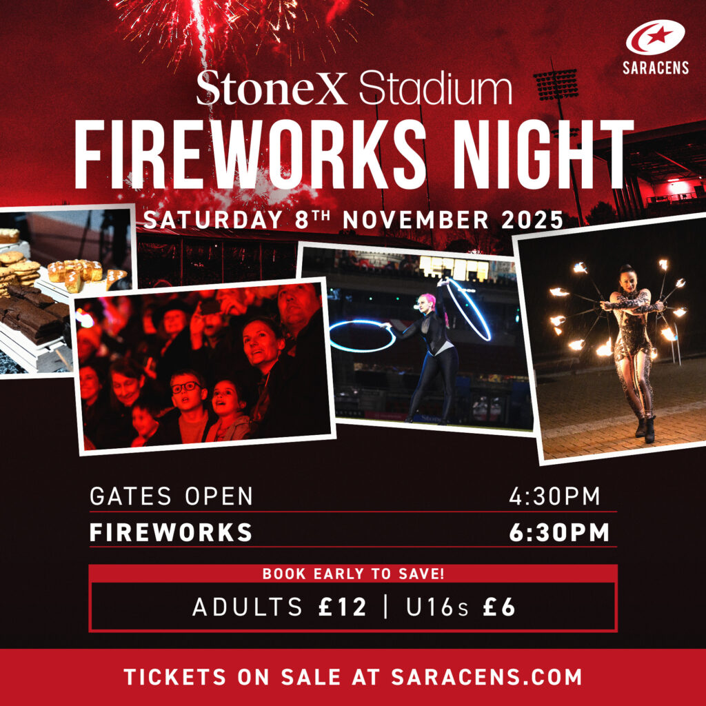 FIREWORKS NIGHT AT STONEX STADIUM – Saracens are promoting a Fireworks Night on Saturday 8 November, you are all welcome, and the gates will be open from 4.30pm with the fireworks commencing at 6.30pm. Details to enter are on the flyer below.